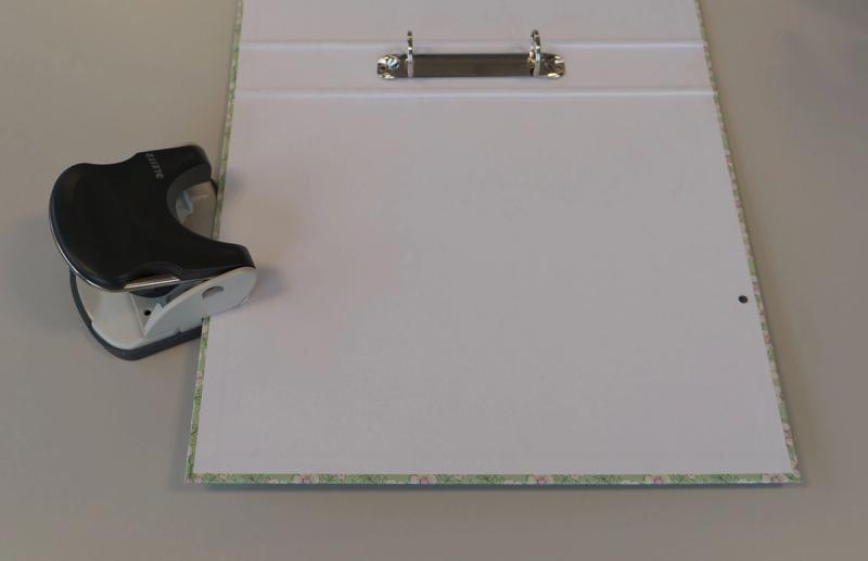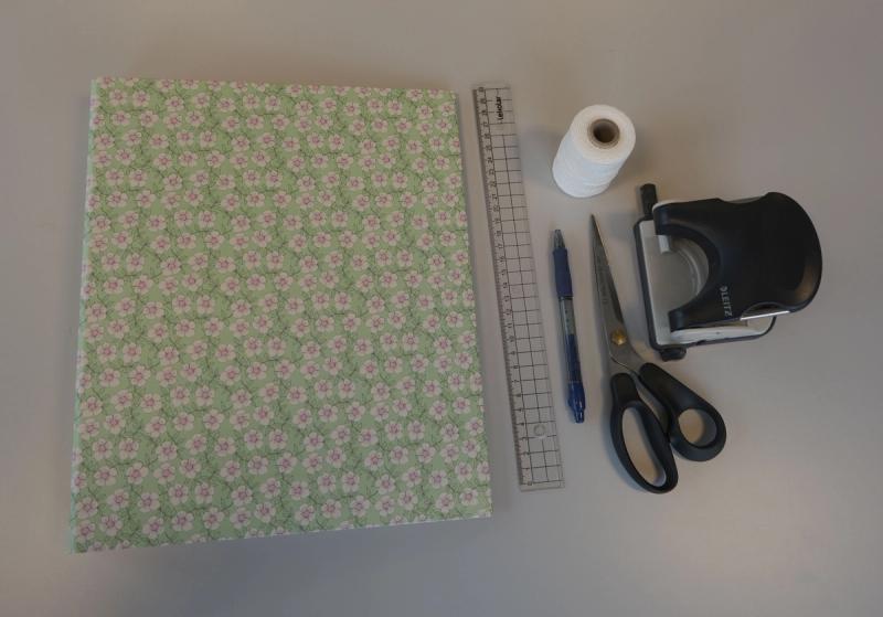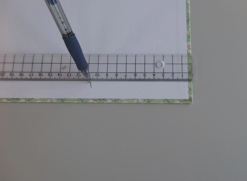 2. Mål opp de fire korteste sidene på permen. Ca. 10 cm fra kanten og opp mot permryggen. Marker med et pennestrek der det skal settes på hull.